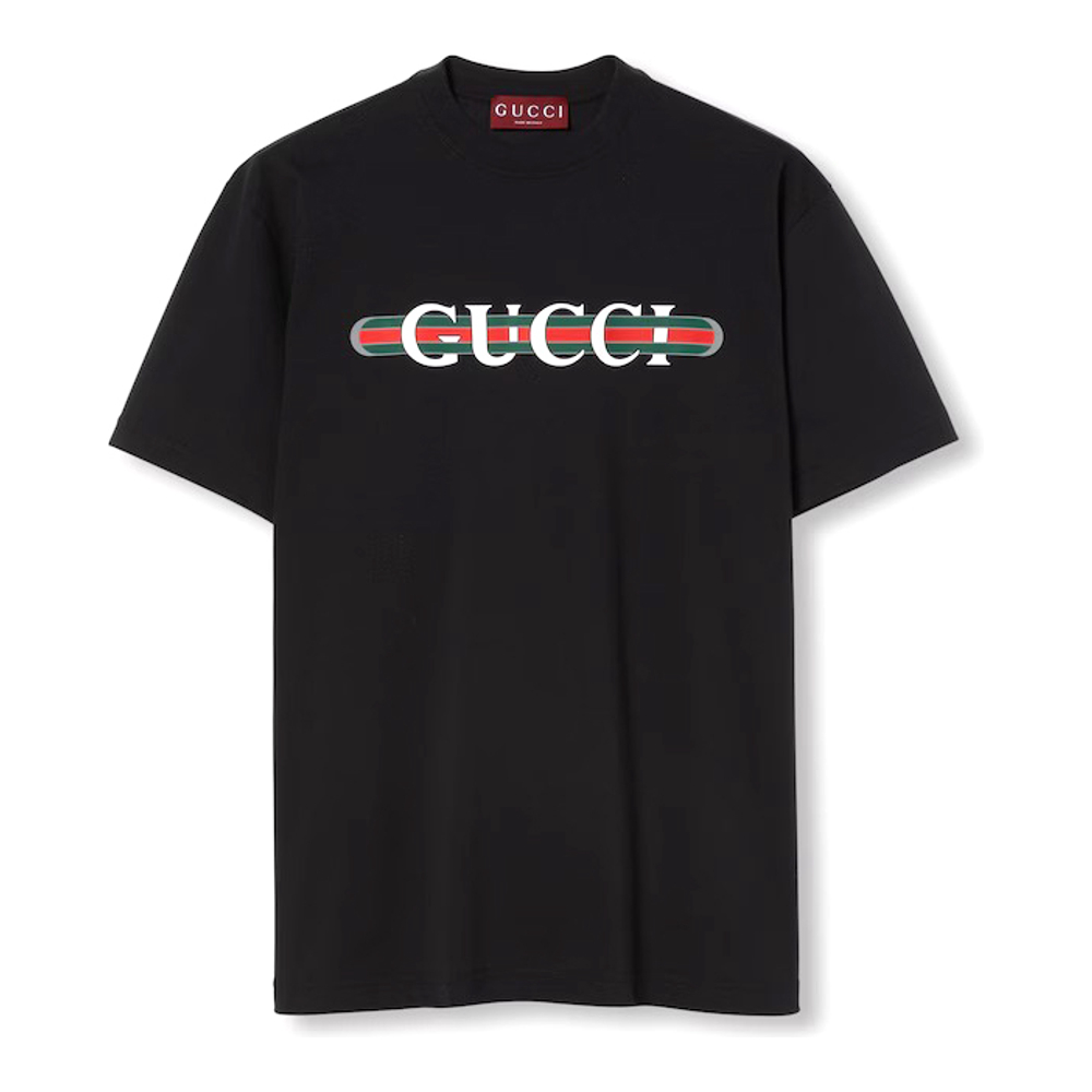 Emblematic codes of the House and refined patterns are reinterpreted in contemporary ways for the Pre-Fall collection. This relaxed T-shirt is presented in black medium cotton jersey and defined by a Gucci Web print.