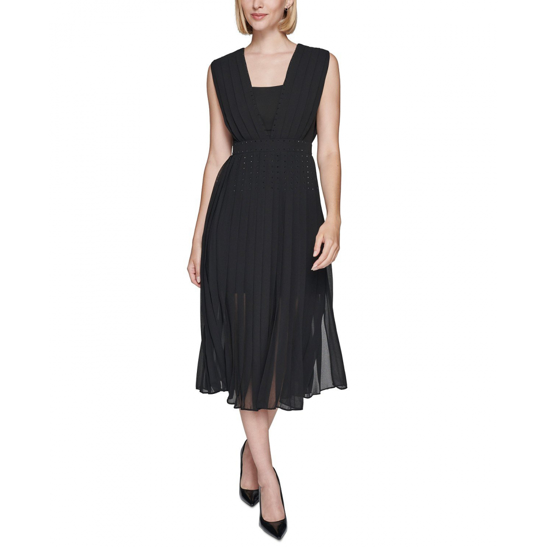 Pleated skirt; tonal rhinestones at upper skirt, waist and neck