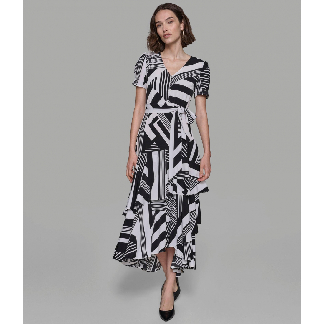 V-NECKLINESHORT SLEEVESWRAP DRESS SILHOUETTEBELTED WAIST AND FRONT BUTTON DETAILCONCEALED BACK ZIPPERLIGHTWEIGHTPOLYESTERHAND WASH COLDSTYLE NUMBER: L4DB8927