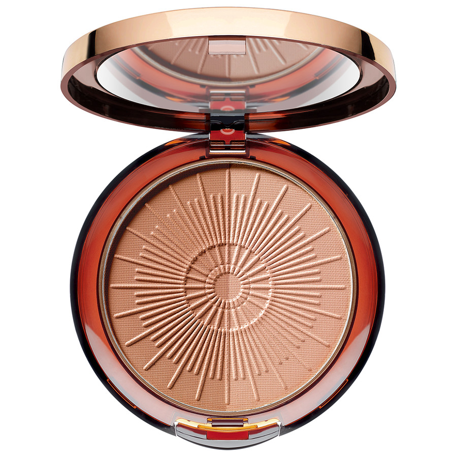 The ultra-light, two-color Bronzing Powder Compact conjures up a natural holiday complexion that looks as if it has been kissed by the sun. Thanks to the four harmonious color duos, you can adapt the Bronzing Powder to your skin tone perfectly. The embossed sun decorations and the elegant, bronze-colored design make you long for summer.