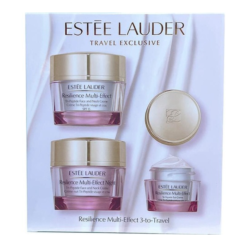 Estee Lauder's 3-to-Travel Resilience Multi-Effect Set contains Tri-Peptide Complex, tested to significantly boost collagen production in just three days, for younger-looking skin. For a healthier glow and more youthful appearance, apply Resilience Multi-Effect Eye Cream morning and night to enhance the eye area while eliminating puffiness and fine lines.