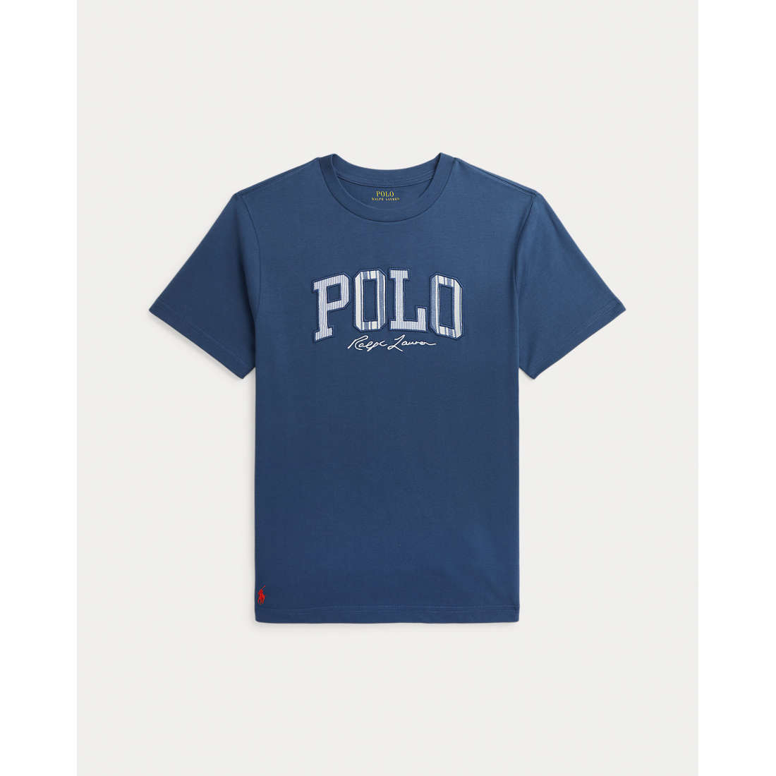 Striped appliqués spelling out "Polo" and "Ralph Lauren" embroidery at the center front.