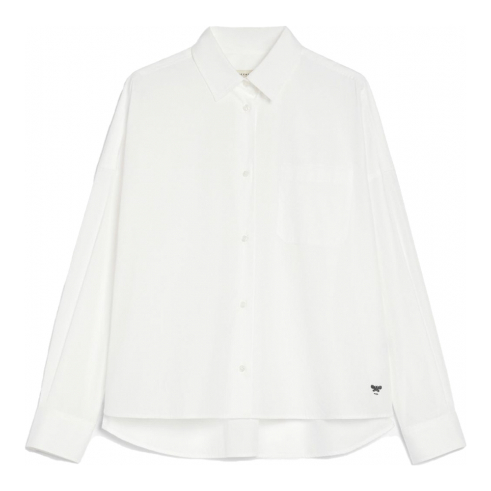 Chemise oversize en popeline de pur coton. Ce modèle présente un col classique, des manches longues basses à poignets boutonnés et une poche poitrine plaquée. Elle est ornée d'une empiècement dos à pinces et d'un ourlet asymétrique arrondi plus ou moins long. Fermeture boutonnée. Le tissu principal contient au moins 50 % de fibres de coton issues de l'agriculture biologique.