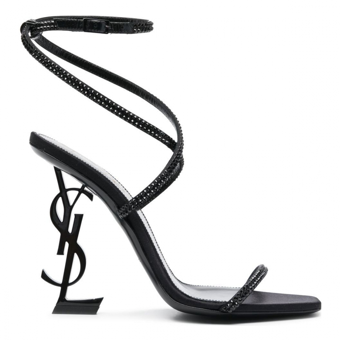 Noir, cuir de veau, talon initiales YSL signature, bride cheville à boucle, bretelles modulables, semelle intérieure griffée, bout ouvert, bout carré, semelle en cuir.