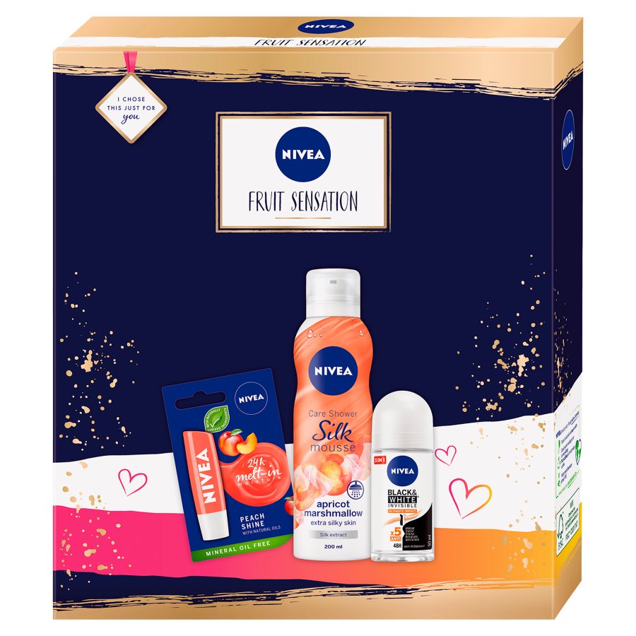 Beinhaltet: Peach Shine Lip Balm 4,8g + Peach Silk Shower Mousse 200ml + Roll On Deodorant 50ml.
