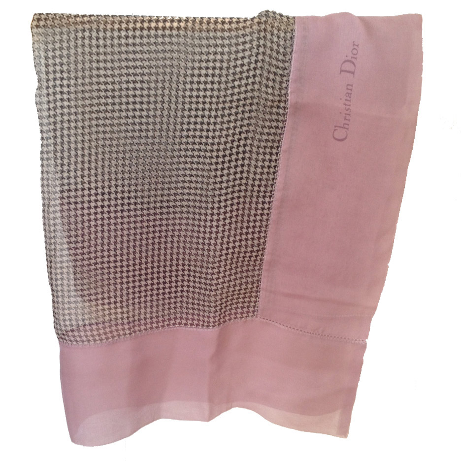Magnifique foulard en pure soie très fine signé Christian Dior, à motif pied de poule noir sur écru et bordure mauve.