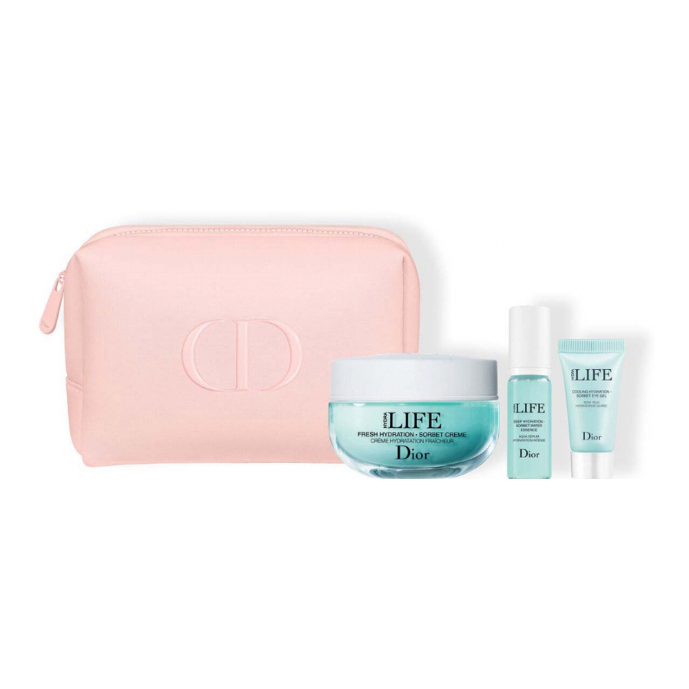Includes: Hydra Life Crème Hydratation Fraîcheur 50 ml + Hydra Life Aqua Sérum Hydratation Intense 7 ml + Hydra Life Soin Yeux Hydratation Givrée 5 ml + Pouch.