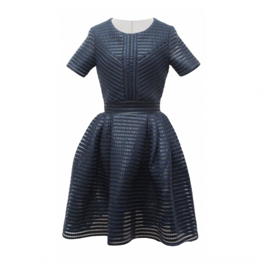 Maje A-line skater dress, short sleeve, scoop neck, and exposed zip closure at the back.